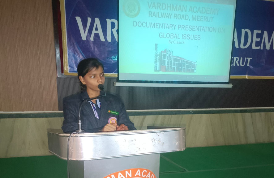 A Documentary Presentation on Global Issues was organized at Vardhman Academy, Railway Road, Meerut by the students of Class XI. The event aimed to create awareness among students about the pressing challenges faced by the world today and to inspire them to think critically and responsibly about global concerns.
