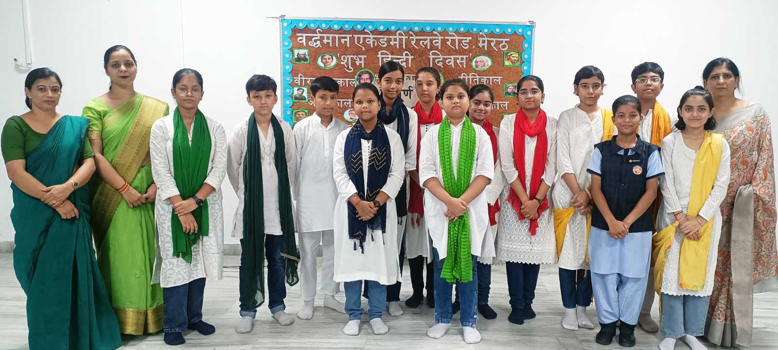 हिंदी दिवस एक ऐसा दिन है जो हमें अपनी मातृभाषा हिंदी की समृद्धि और गौरव का एहसास कराता है। हिंदी सिर्फ एक भाषा ही नहीं बल्कि हमारी संस्कृति, सभ्यता और पहचान की धरोहर हैं। इस भाषा में वो मिठास है, जो हृदयो को जोड़ती है और भावनाओं को व्यक्त करने में अद्वितीय सहयोग प्रदान करती है। इस दिन को सार्थकता प्रदान करने हेतु आज दिनांक 14 सितंबर ,2024 को रेलवे रोड स्थित वर्धमान एकेडमी के विशाल सभागार में विभिन्न रचनात्मक गतिविधियो का आयोजन किया गया। कक्षा 3 से 5 तक के छात्र-छात्राओ के मध्य दोहा गायन प्रतियोगिता का आयोजन किया गया। सभी प्रतिभागियों ने मीरा, कबीर, रहीम आदि अलग-अलग कवियों का रूप धारण कर सस्वर दोहा गायन प्रतियोगिता में भाग लिया ।कक्षा 6 से 8 तक के विद्यार्थियों के मध्य अंतर सदन "हास्य कविता" का आयोजन किया गया।