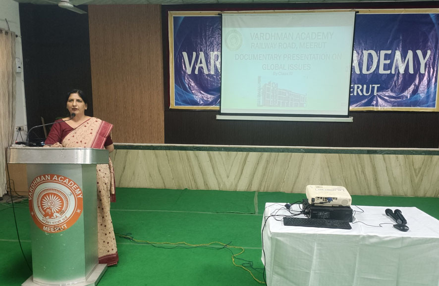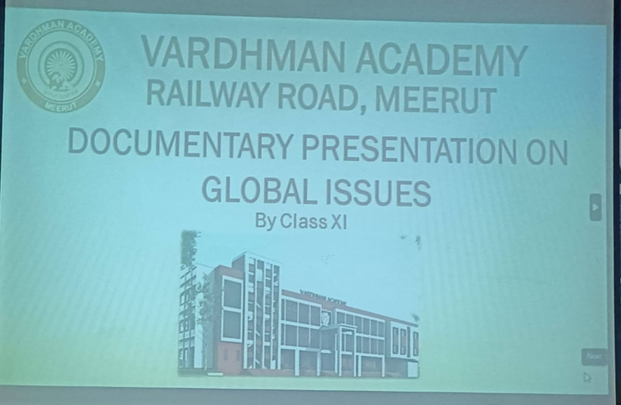 A Documentary Presentation on Global Issues was organized at Vardhman Academy, Railway Road, Meerut by the students of Class XI. The event aimed to create awareness among students about the pressing challenges faced by the world today and to inspire them to think critically and responsibly about global concerns.