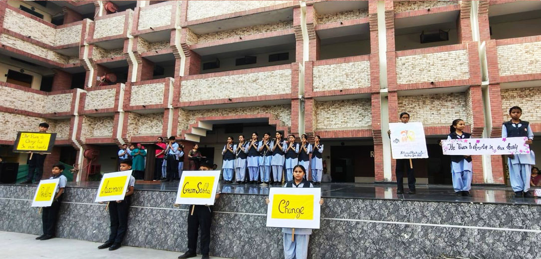 The presentation included a confident speech, thoughtful news highlights, a powerful thought of the day, and a well-enacted skit that beautifully depicted the role of awareness, unity, and participation in strengthening our villages. With creative expressions and placards like "Problem," "Awareness," "Gram Sabha," and "Change," the students conveyed a strong message that true development begins when individuals take responsibility for their own community. Under the able guidance and constant encouragement of our respected Principal Ma'am, such enriching platforms continue to nurture responsible and aware young citizens.